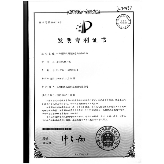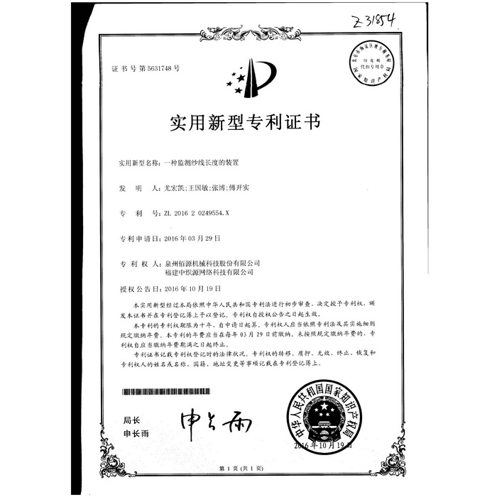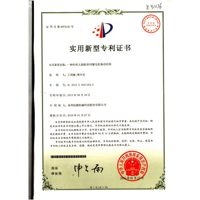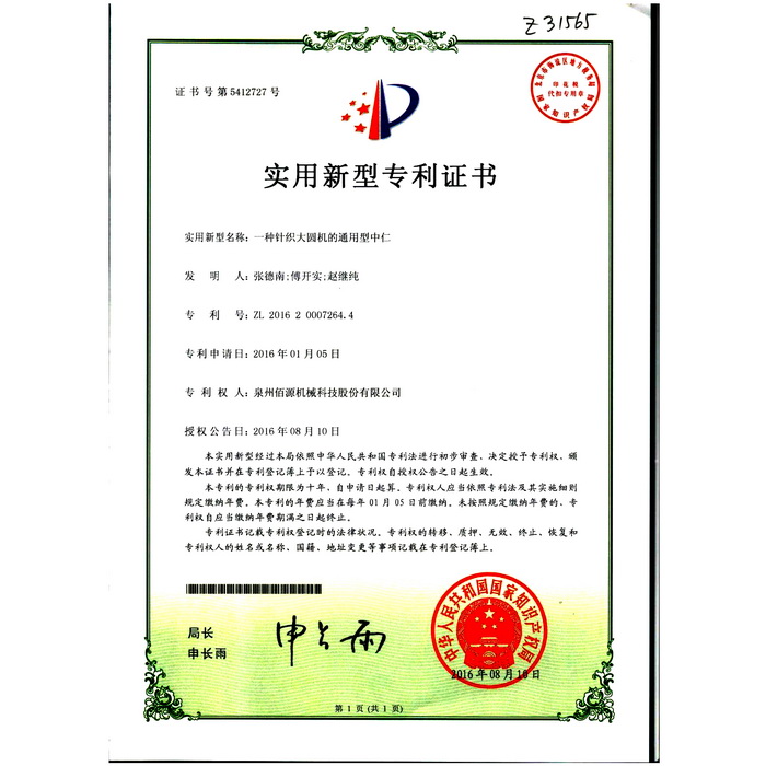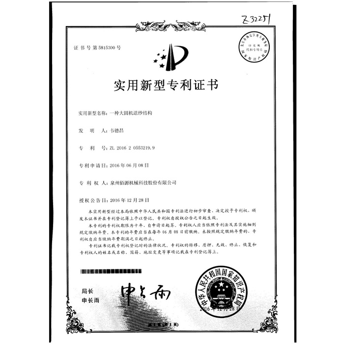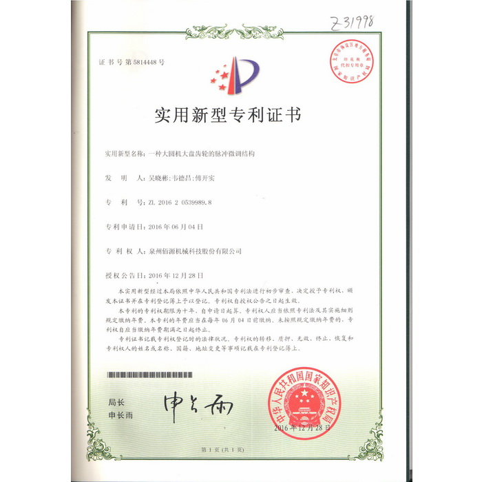 新型-泉州佰源機械科技股份有限公司 一種大圓機大盤齒輪的脈沖微調(diào)結構 實用新型專利證書